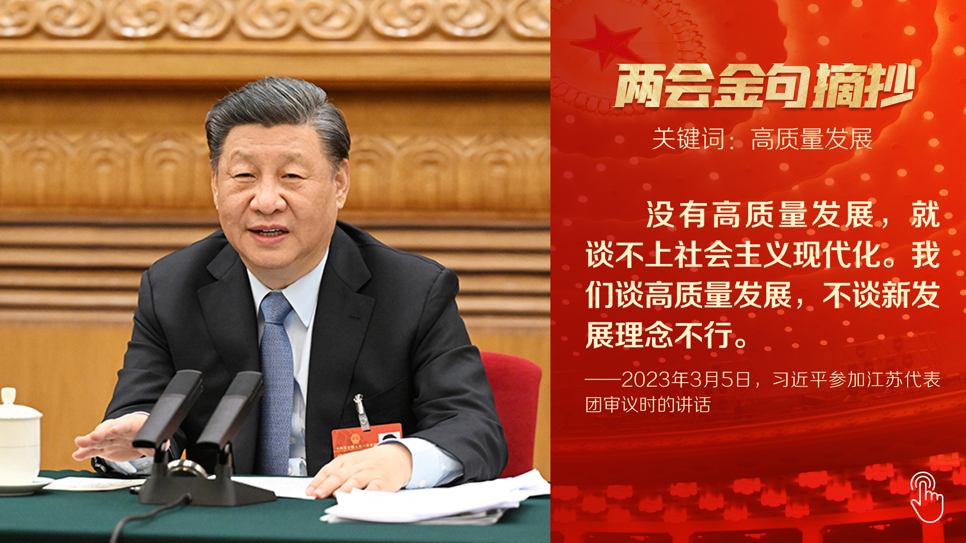 “高质量发展是全面建设社会主义现代化国家的首要任务。”今年两会首次到团组,总书记以高质量发展为题,详细阐述中国未来施政发力点。第二天参加民建、工商联界委员联组会,他又就正确引导民营经济健康发展、高质量发展作出重要论述,一句“要坚守主业、做强实业,自觉走高质量发展路子”为全国4700多万家民营企业指明方向。十四届全国人大一次会议闭幕会上,总书记再次向世界宣示:在强国建设、民族复兴的新征程,我们要坚定不移推动高质量发展。