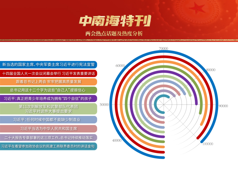 3月,世界目光,聚焦北京。近3000名中外记者采访报道全国两会。央视网“智闻”系统提取分析两会期间全网时政新闻热点显示,习近平总书记的两会关切吸引全网目光,新征程领路人的人民情怀成为网友“两会印象”最深刻的主题之一。