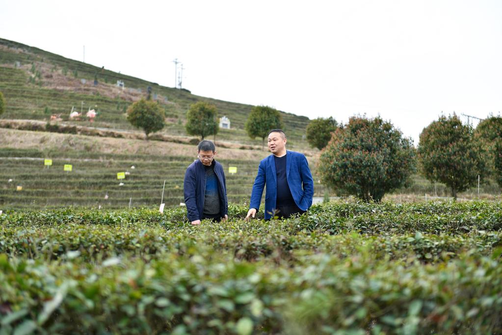 罗新亮(右)在茶园查看茶叶长势。新华社记者陈振海 摄