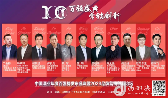 西部决策网讯(记者刘玉 韩宗宪)聚焦中国酒业百强群英,助力品牌营销创新管理。4月9日,中国酒业年度百强榜发布盛典暨2023品牌营销创新论坛在成都盛大开启。行业各协会领导、智库专家、意见领袖及全国200家企业和经销商代表,共同见证行业百强与酒业营销人的风采。