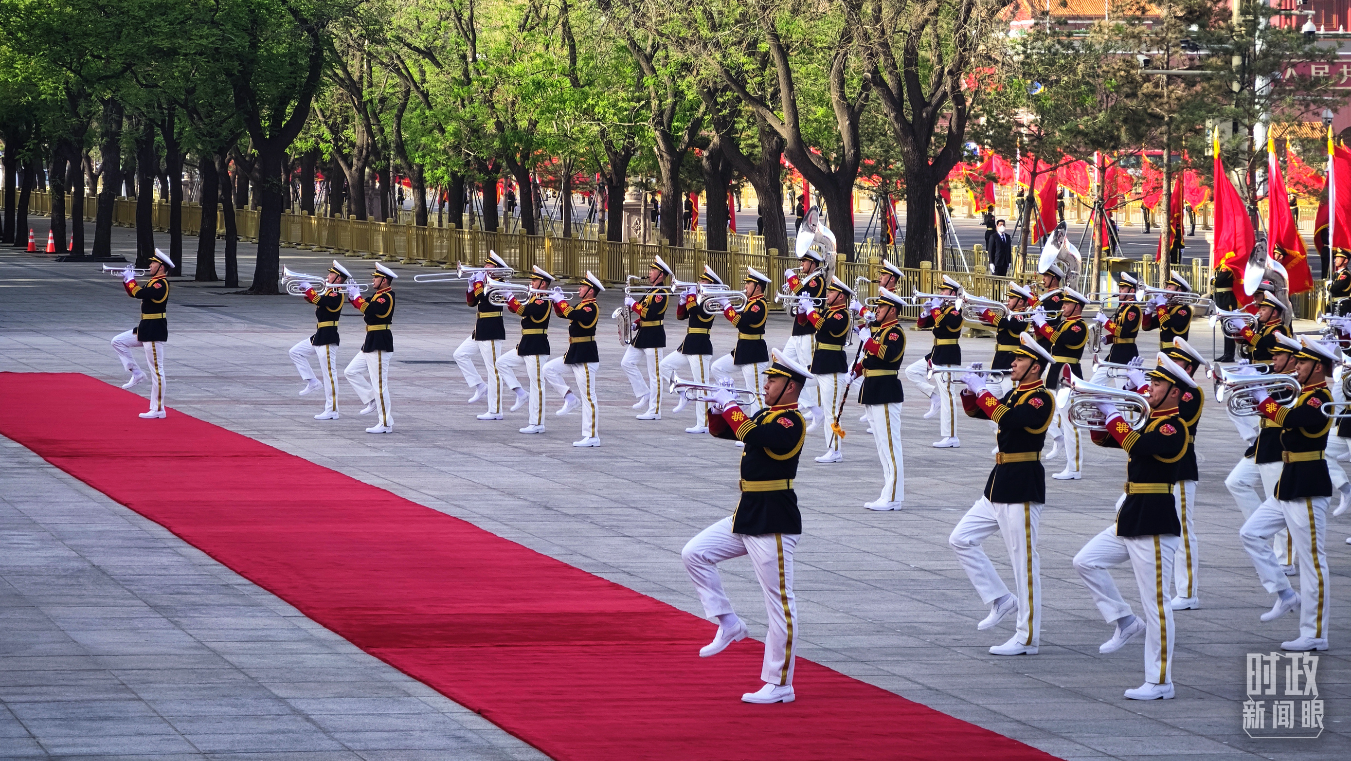 △欢迎仪式现场的军乐团正在进行行进吹奏表演。(总台央广记者潘毅拍摄)