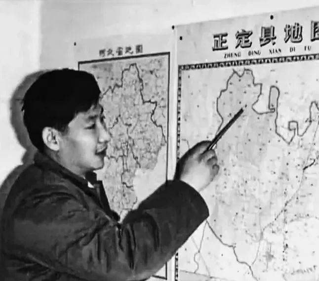 习近平在办公室地图前谋划正定的发展。(图源:《让群众过上好日子——习近平正定足迹》)
