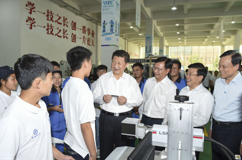 2015年6月17日,习近平在贵州省机械工业学校实训基地勉励学生加强操作训练、不断取得优异成绩。