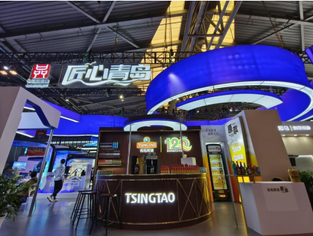 与往年展会不同,青岛啤酒在展台设计上,一枚红、绿、金三色勾勒的120周年纪念标识,格外引人注目,试饮杯中、啤酒泡沫上,纪念标识的拉花与之呼应成趣。