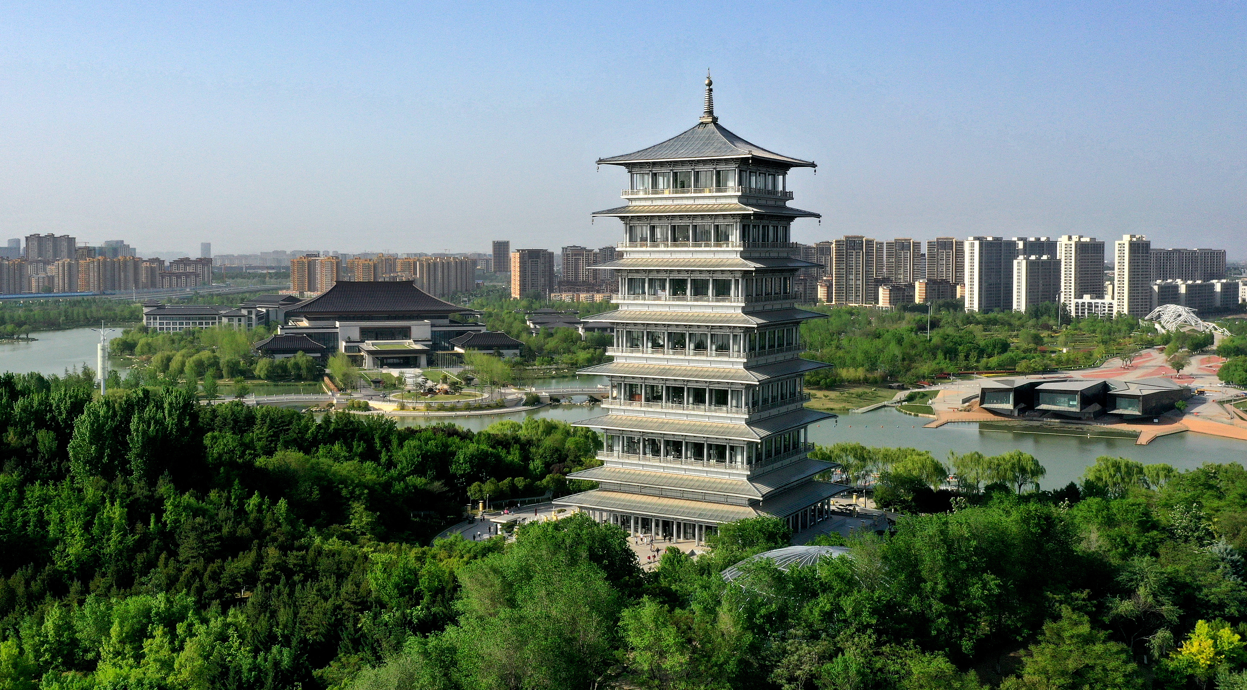 位于西安浐灞生态区的长安塔(2023年4月16日摄,无人机照片)。新华社记者 刘潇 摄