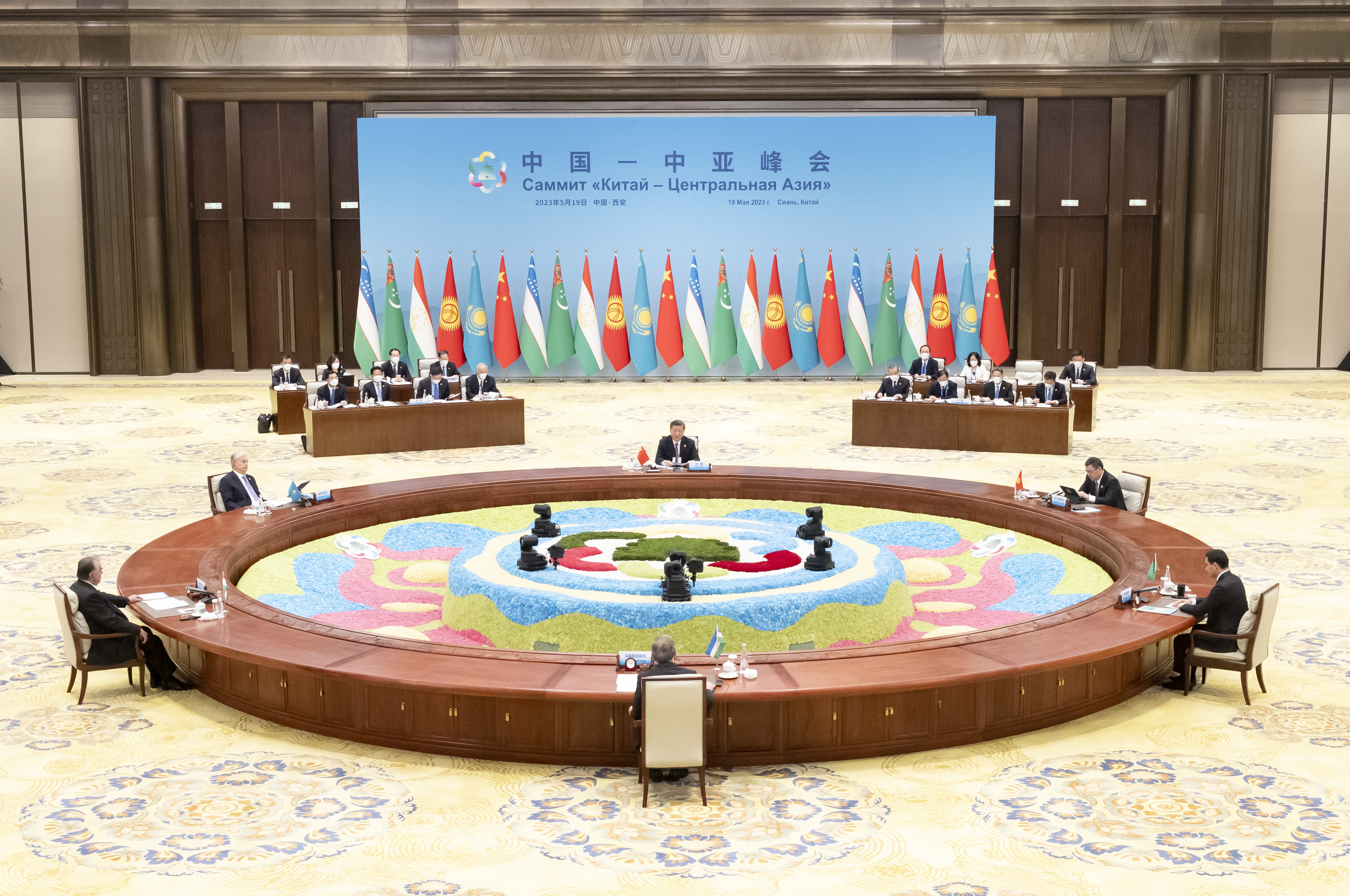 5月19日上午,国家主席习近平在陕西省西安市主持首届中国-中亚峰会并发表题为《携手建设守望相助、共同发展、普遍安全、世代友好的中国-中亚命运共同体》的主旨讲话。哈萨克斯坦总统托卡耶夫、吉尔吉斯斯坦总统扎帕罗夫、塔吉克斯坦总统拉赫蒙、土库曼斯坦总统别尔德穆哈梅多夫、乌兹别克斯坦总统米尔济约耶夫出席。新华社记者 丁海涛 摄