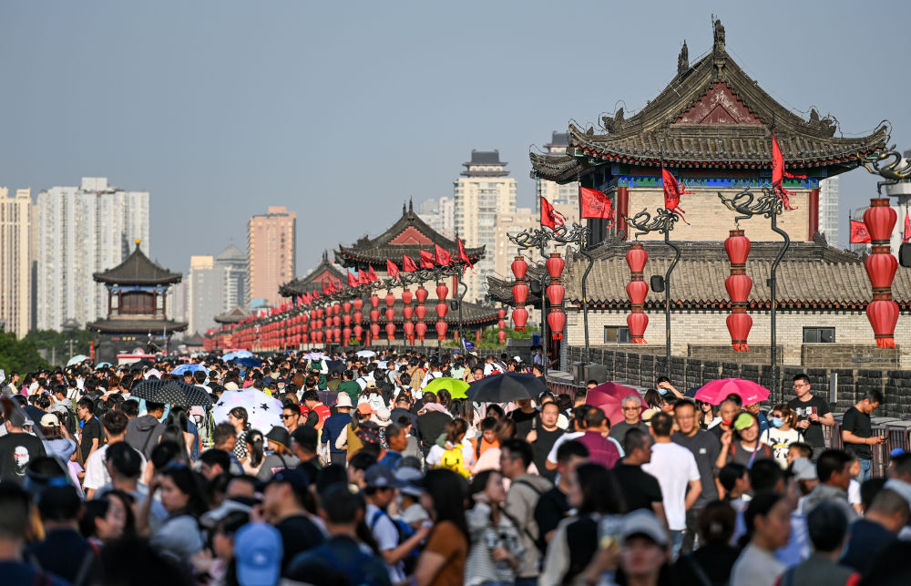 游客在西安城墙景区参观游览(4月30日摄)。新华社发(邹竞一 摄)