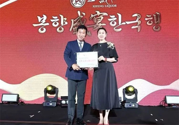 自进入韩国市场以来,西凤酒以大气雅致的包装、卓越优秀的品质、醇香甘美的口感赢得了广大消费者的喜爱,销售业绩连年翻倍增长,并连续两年荣获“韩国酒类鉴赏大赛”特等奖及“Best of 2023”大奖。会上,陕西西凤酒股份有限公司副总经理、营销公司总经理周艳花为韩国华冈酒业株式会社颁发“海外拓展奖”,对金岚洙社长及其团队为西凤酒市场拓展所做出的的努力表示感谢。