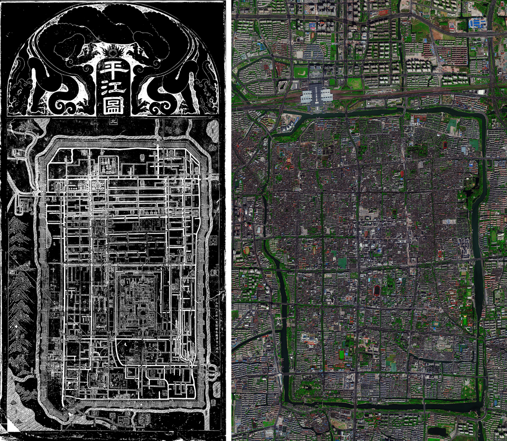 拼版照片:左图为宋代碑刻《平江图》(资料照片);右图为2023年3月拍摄的苏州古城的卫星图像。