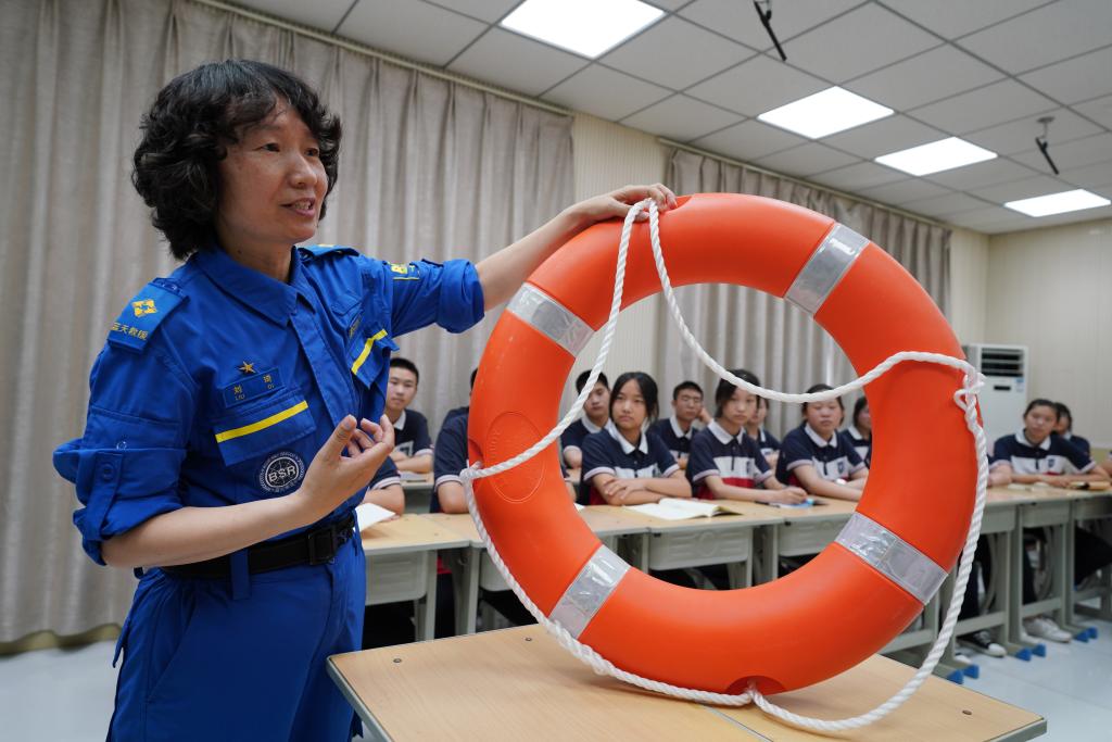 河北邢台蓝天救援队志愿者指导邢台市第八中学学生使用救生圈。 新华社记者骆学峰 摄