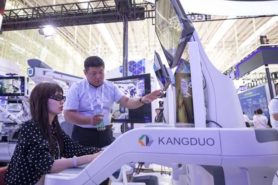 在黑龙江省哈尔滨市举办的2022世界5G大会展厅里,参展商现场演示5G远程手术机器人(2022年8月10日摄)。新华社记者 张涛 摄