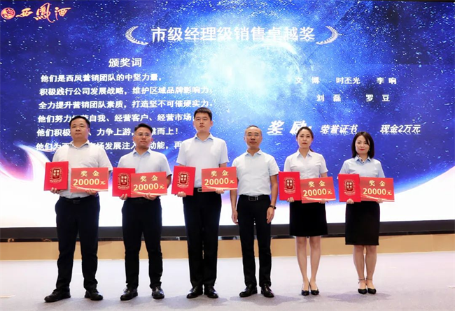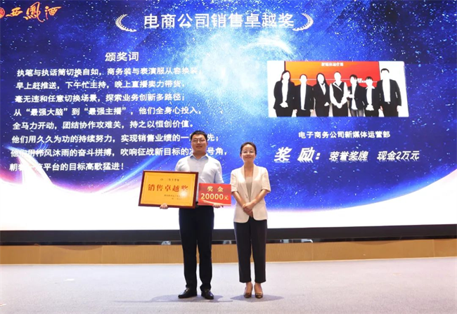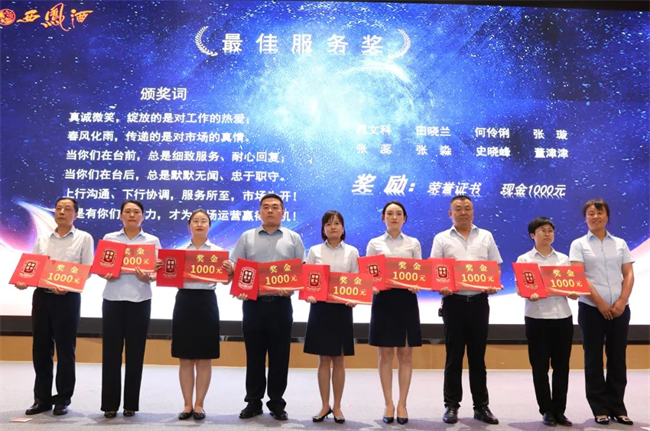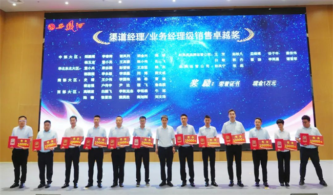 西凤股份公司财务管理部部长陈宏利为业务经理销售卓越奖获得者颁发荣誉证书与奖金