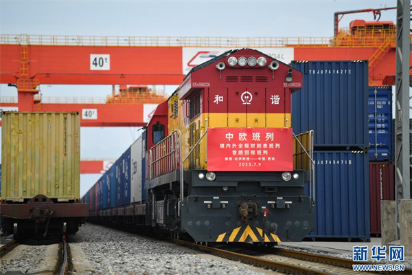 这是7月10日拍摄的从德国杜伊斯堡返回西安国际港站的X8008次中欧班列。7月9日,满载着汽车零件、电子仪器、化妆品、啤酒等货物的X8008次中欧班列驶入西安国际港站,标志着中欧班列境内外全程时刻表班列首次实现了有来有往,为服务“一带一路”建设,助力丝路沿线国家贸易互通注入新动能。新华社记者 张博文 摄