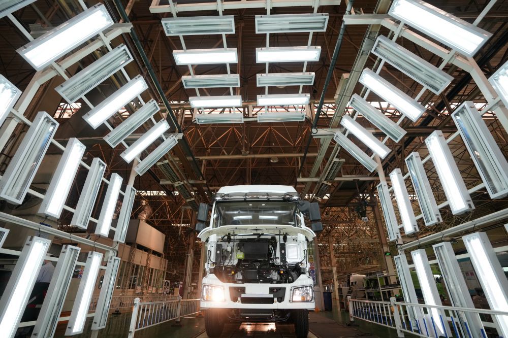 2022年5月24日,在陕西汽车控股集团有限公司总装车间,一辆装配完毕的陕汽重型卡车等待验收。新华社记者 李一博 摄