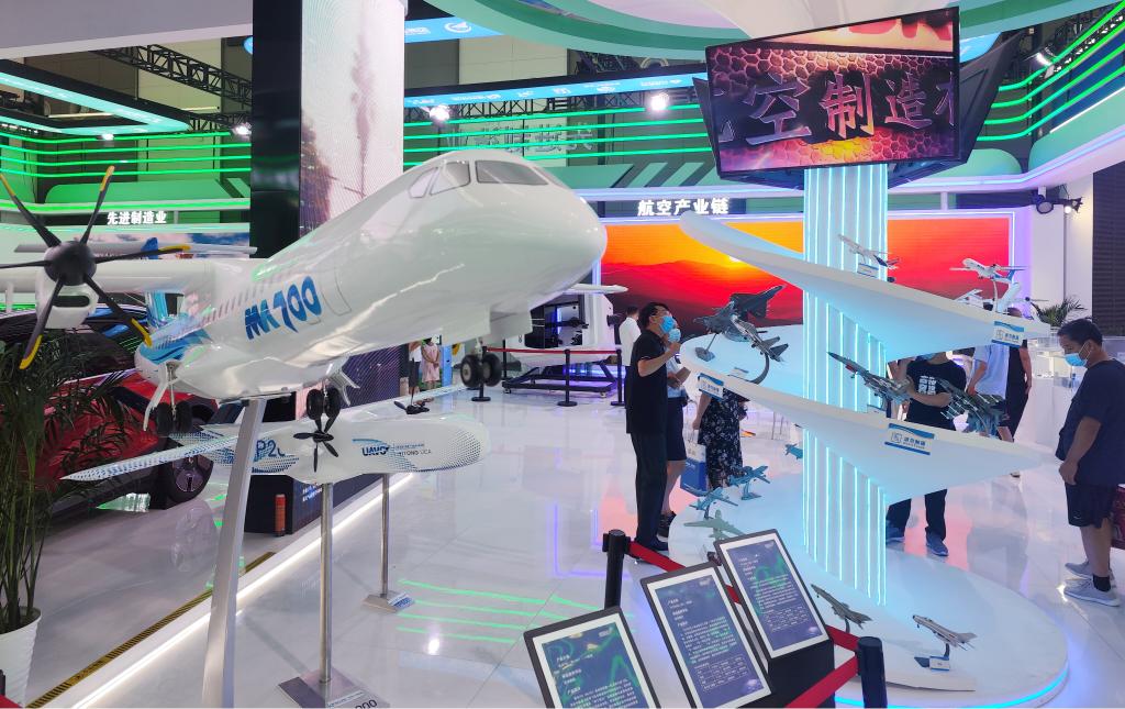 2022年8月16日,在第六届丝绸之路国际博览会上,观众在西安展区了解航空制造业。新华社记者 李一博 摄