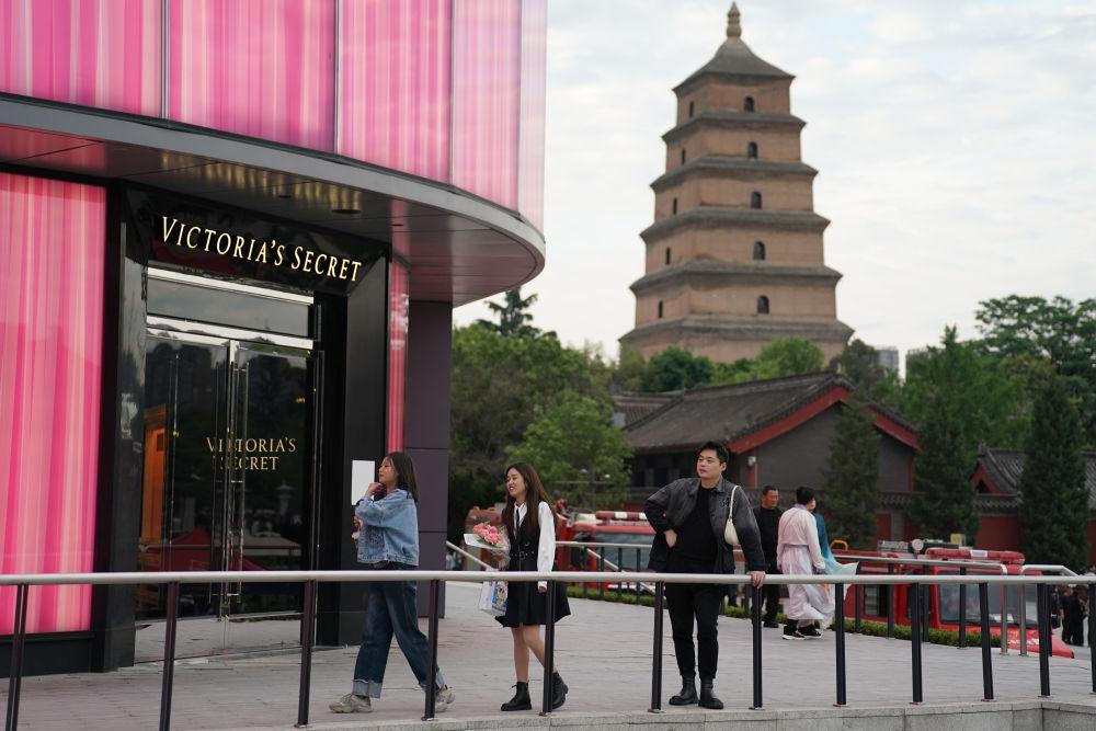 游客在西安大雁塔边一家商业综合体附近游玩(5月8日摄)。