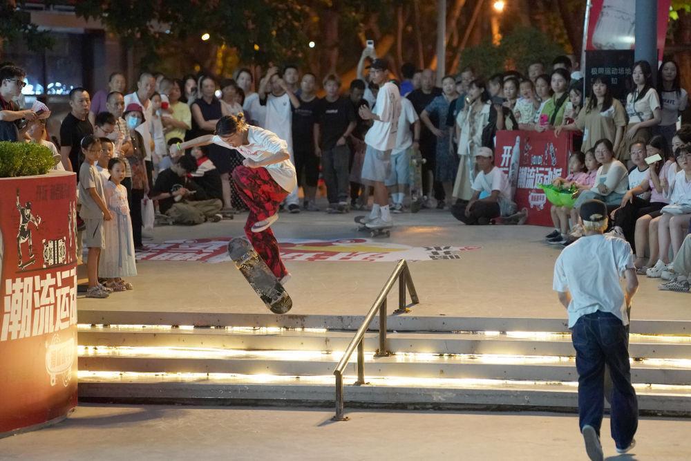 7月30日,滑板爱好者在西安市一商业街区进行滑板表演有奖竞赛活动。新华社记者 邵瑞 摄