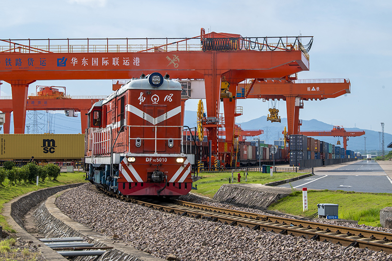 △2023年7月25日,在浙江省金华市华东国际联运港,一辆“义新欧”中欧班列装载着110个标箱日用百货、家用电器、家装材料等货物,启程驶向哈萨克斯坦。