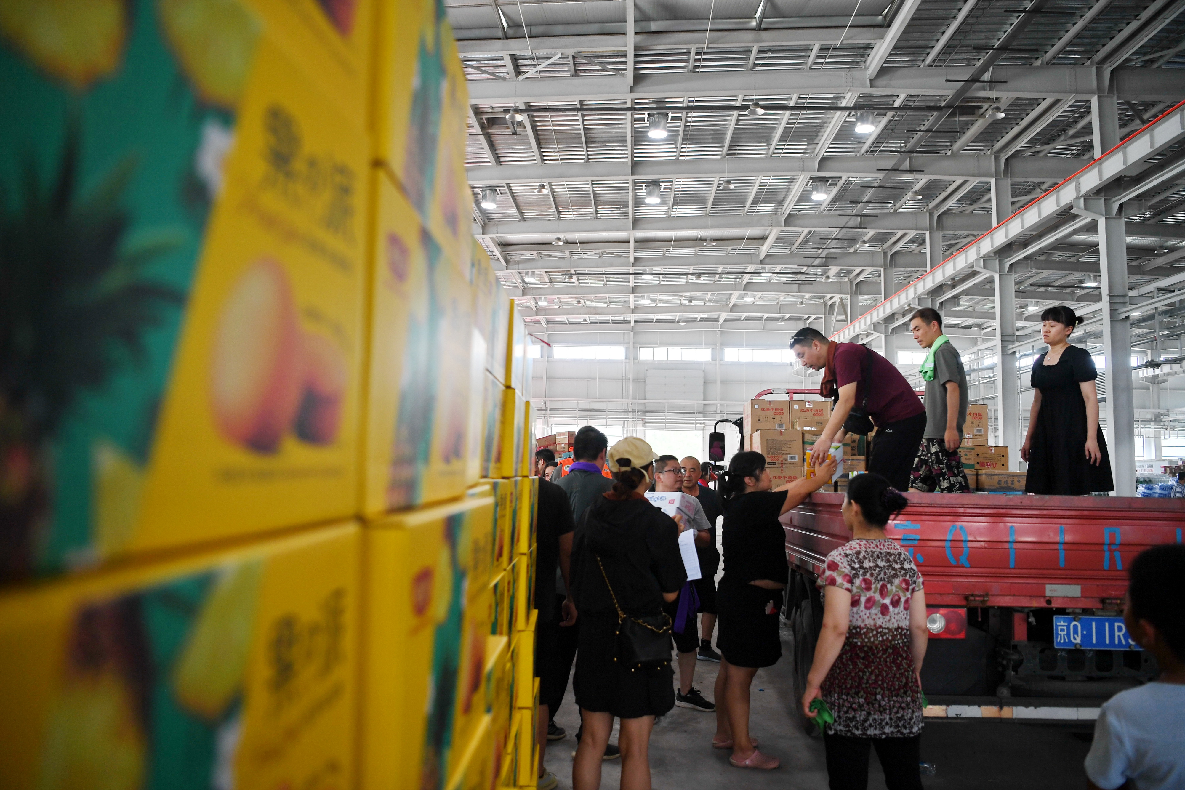 工作人员和志愿者在河北省涿州市钢研物资储备点内将捐赠物资装车外运(8月5日摄)。新华社记者 牟宇 摄