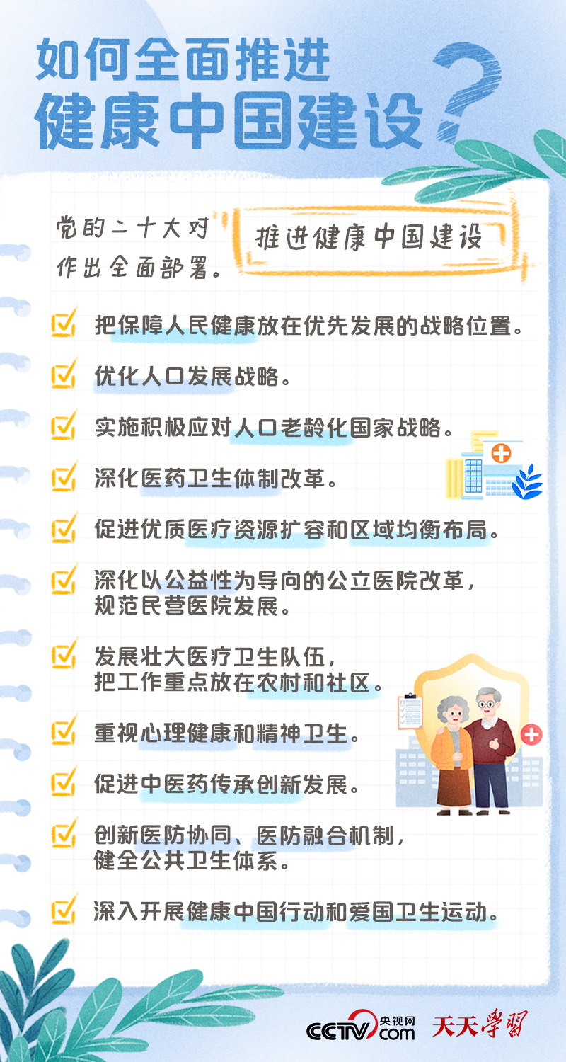 党的二十大报告将“建成健康中国”作为到2035年我国发展的总体目标之一,并指出,人民健康是民族昌盛和国家强盛的重要标志,把保障人民健康放在优先发展的战略位置,完善人民健康促进政策。什么是健康中国?如何全面推进健康中国建设?央视网《天天学习·学习笔记》特梳理相关内容,为您解读总书记治国理政关键词——健康中国。