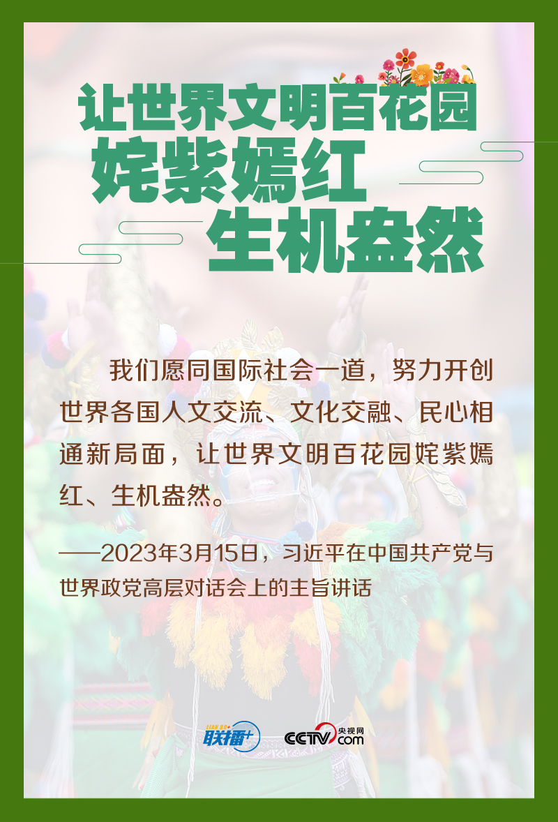 联播+2023年年初,习近平总书记在中国共产党与世界政党高层对话会上首次提出全球文明倡议。他强调,我们要共同倡导加强国际人文交流合作,探讨构建全球文明对话合作网络,丰富交流内容,拓展合作渠道,促进各国人民相知相亲,共同推动人类文明发展进步。