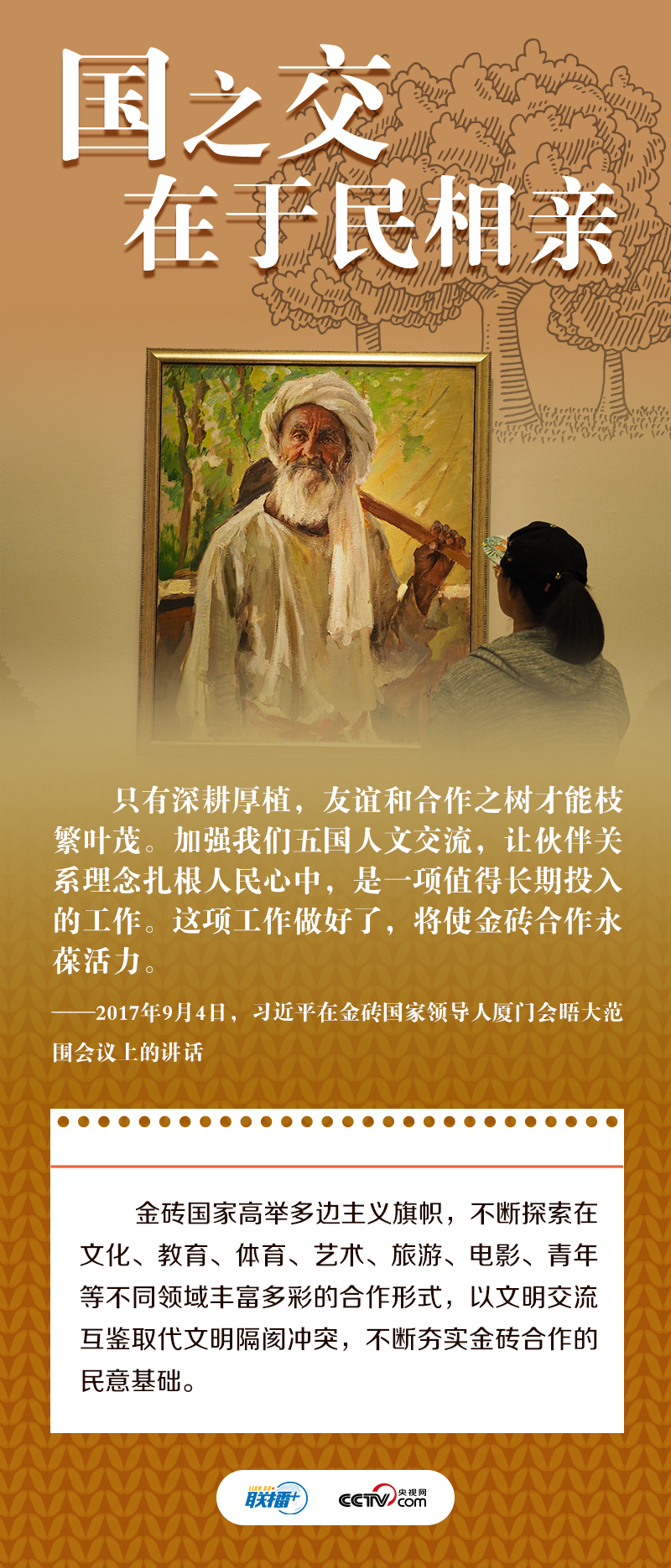 “我们五国虽然山海相隔,但怀着合作共赢的共同目标走到了一起”。“独木不成林。在经济全球化深入发展的时代条件下,金砖国家发展不能独善其身,必须在谋求本国发展的同时促进各国共同发展”。十多年来,习近平主席多次出席或主持金砖国家领导人会晤,论述金砖合作之道,提出“金砖+”合作理念,为推动金砖合作走深走实贡献中国智慧,在金砖国家合作进程中留下深刻的“中国印记”。