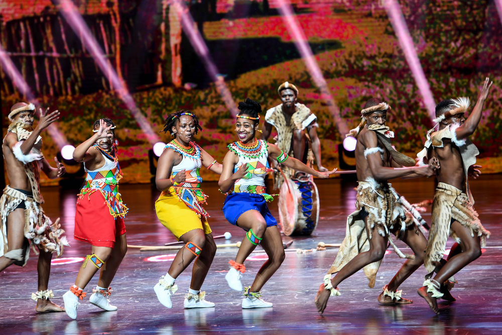 来自南非的演员在中国内蒙古呼和浩特市举行的第十一届中国国际民间艺术节上表演《祖鲁歌舞》(2019年8月23日摄)。