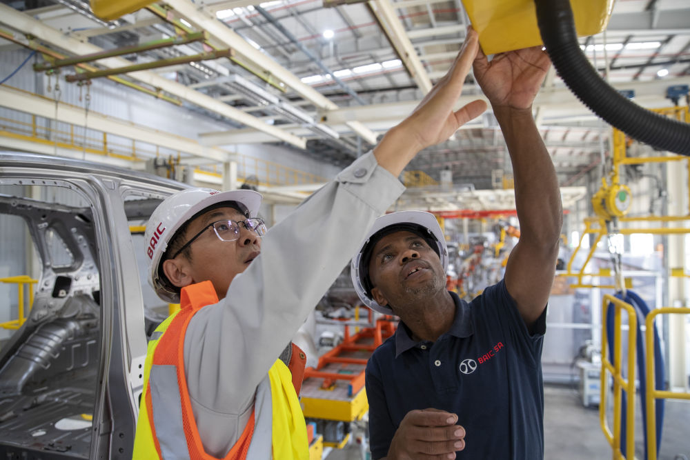 在南非东开普省北汽南非工厂,南非员工邦加尼(右)与中国同事方龙一起工作(2023年5月9日摄)。2022年,中国汽车品牌在南非的销量突破3.5万台,2023年预计将突破4万台。