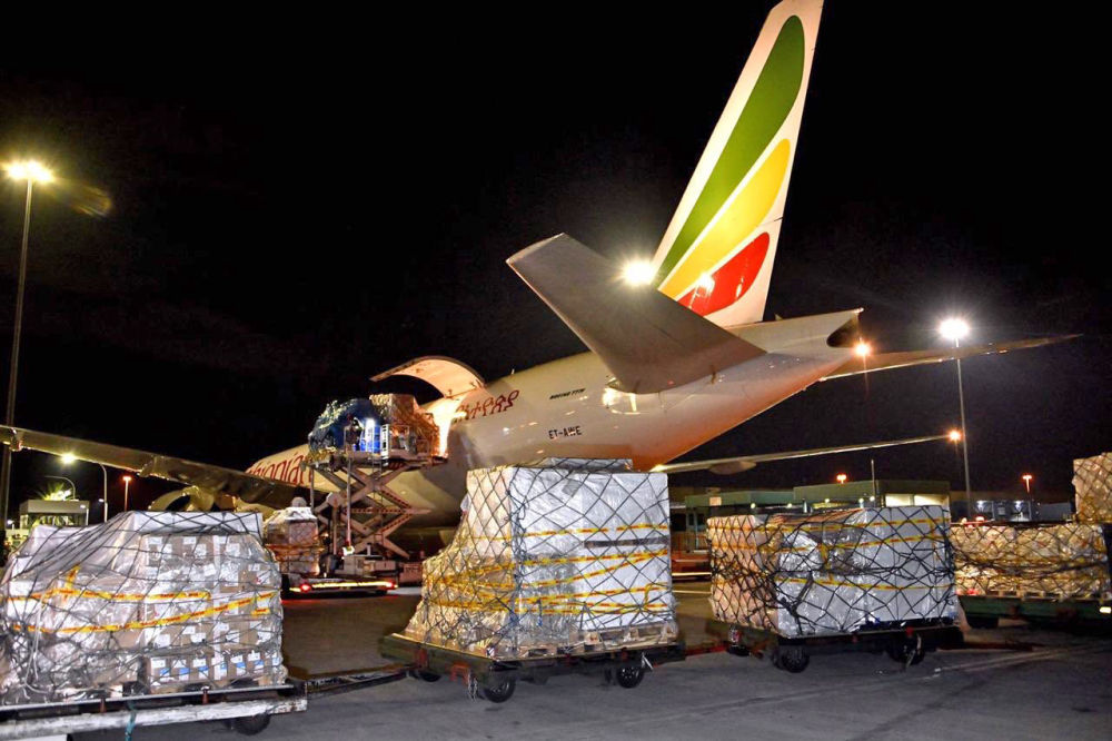 中国援助的抗疫物资抵达南非约翰内斯堡(2020年4月14日摄)。
