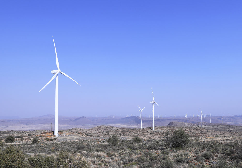 这是在南非北开普省德阿镇拍摄的德阿风电项目风机(2023年8月10日摄)。由中国龙源电力集团南非公司运营的德阿风电项目每年发电量超过7.5亿千瓦时,相当于节约20多万吨标准煤,减排二氧化碳约70万吨。