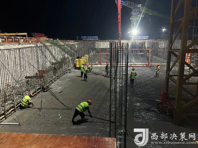 九层之台,始于垒土。筏板作为基础工程最重要的组成部分,其质量的好坏直接影响到上部结构的稳固性。在完成筏板钢筋绑扎后,2台长臂泵车、34辆混凝土罐车开始送料。浇筑期间,映入眼帘的是一片繁忙之景,22名管理人员,110余名劳务人员正以时不我待的紧迫感,全力以赴抓紧抓实项目建设,共同助力项目建设跑出加速度。