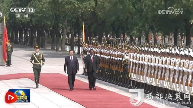 希奇莱马在习近平陪同下检阅中国人民解放军仪仗队。