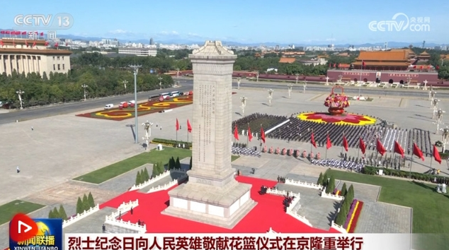 今天是我国第十个“烈士纪念日”。庄严的天安门广场上,鲜艳的五星红旗高高飘扬。广场中央,“祝福祖国”巨型花篮表达着对国家繁荣富强的美好祝福。人民英雄纪念碑巍然耸立,北侧两组花坛上白菊等鲜花组成的18个花环,寄托着全体中华儿女对英烈的深情追思。