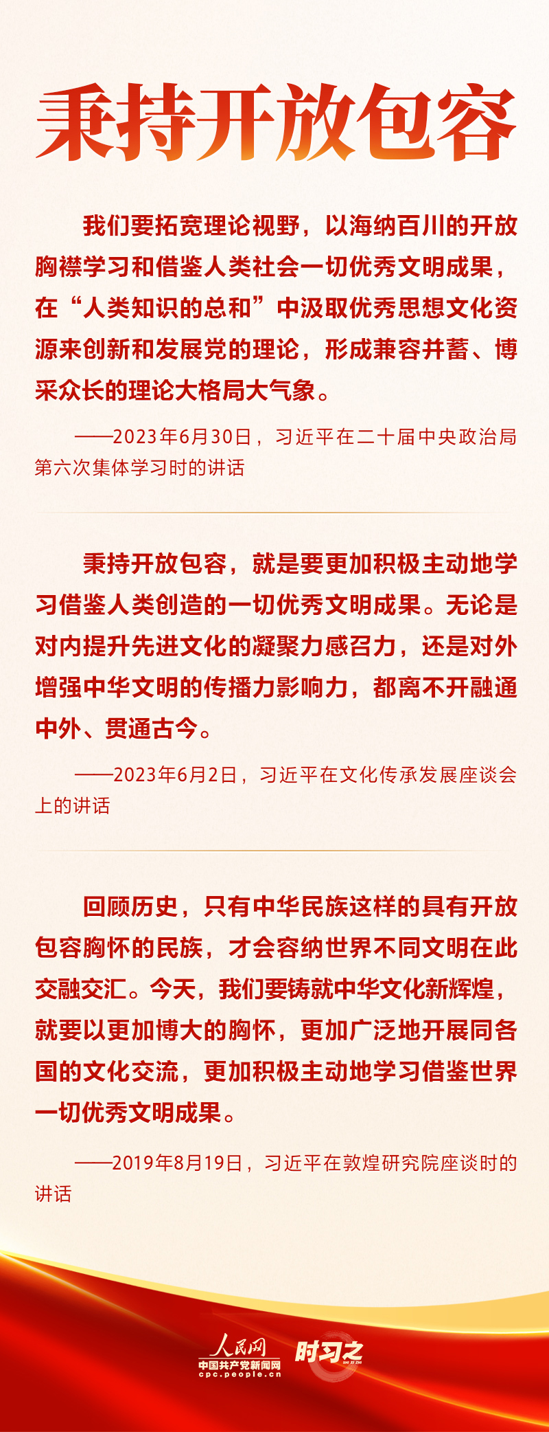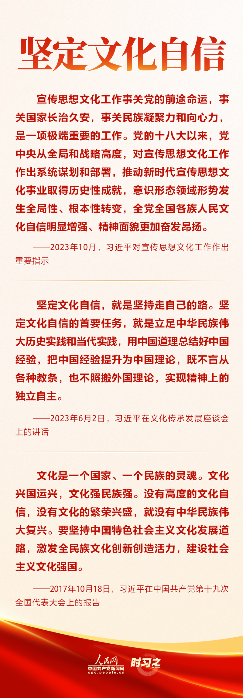围绕在新的历史起点上继续推动文化繁荣、建设文化强国、建设中华民族现代文明这一新的文化使命,习近平总书记一以贯之强调要“坚定文化自信”“秉持开放包容”“坚持守正创新”。