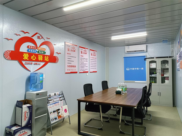 服务站门口即是S312省道,距离转体梁主要施工工点不足500米,步行8到10分钟可达。服务对象包括劳动工人、环卫绿化工人、市政维修工人等户外劳动者。站点内温暖明亮,空调和饮水机的冷热水24小时提供便利,雨伞架、充电站解决燃眉之急。急救药箱内含有退烧贴和暖贴,感冒消炎、消毒止血常备药以供不时之需,除此之外还增设特色阅读区,各类书籍、月刊、报纸可供劳动者休息时阅读放松,并由工作人员定期更新。