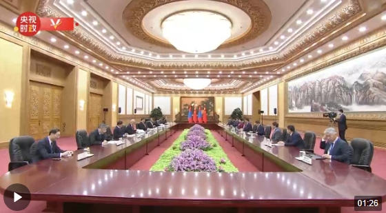 10月19日上午,国家主席习近平在人民大会堂会见来华出席第三届“一带一路”国际合作高峰论坛的蒙古国总统呼日勒苏赫。