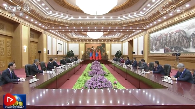 10月19日上午,国家主席习近平在人民大会堂会见来华出席第三届“一带一路”国际合作高峰论坛的蒙古国总统呼日勒苏赫。