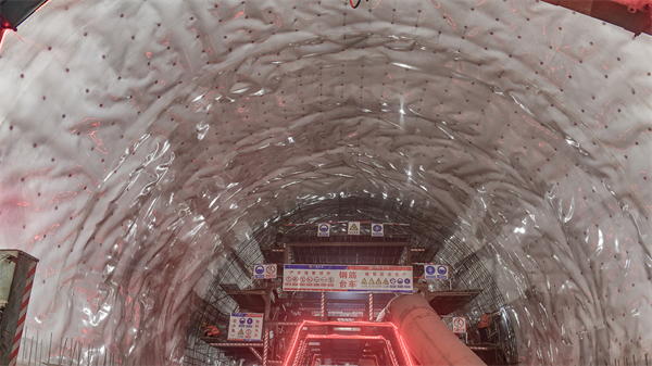柳梧铁路项目,配置的自行式液压栈桥进行仰拱衬砌和仰拱填充施工,实现钢筋绑扎、混凝土施工、养护等多工序平行作业;配置的模板液压定位系统和止水带定位夹具,保证定位精度和施工效率的提高;使用防水板铺挂台车,实现4米宽幅防水板的铺设,减少防水板搭接尺寸,降低防水板损耗率和提高作业效率。对标准化施工最具实际意义的是采用的全液压自动浇筑衬砌模板台车,其主要由模板系统、门架系统、辅助操作系统、支撑系统、分料系统、平移顶升机构、行走系统组成,通过增设调节块,能适用不同加宽值断面隧道拱墙衬砌施工;二方面,其前端创新地使用可调式高分子堵头模,就具备止水带定位和固定功能;三是平台设计自动布料系统,能够实现逐窗灌注;四是顶部设置径向注浆、溢浆、排气装置,满足了带模注浆工艺;五是端头采用软搭接,防止顶裂上一板混凝土,为保证混凝土质量提供了保险。