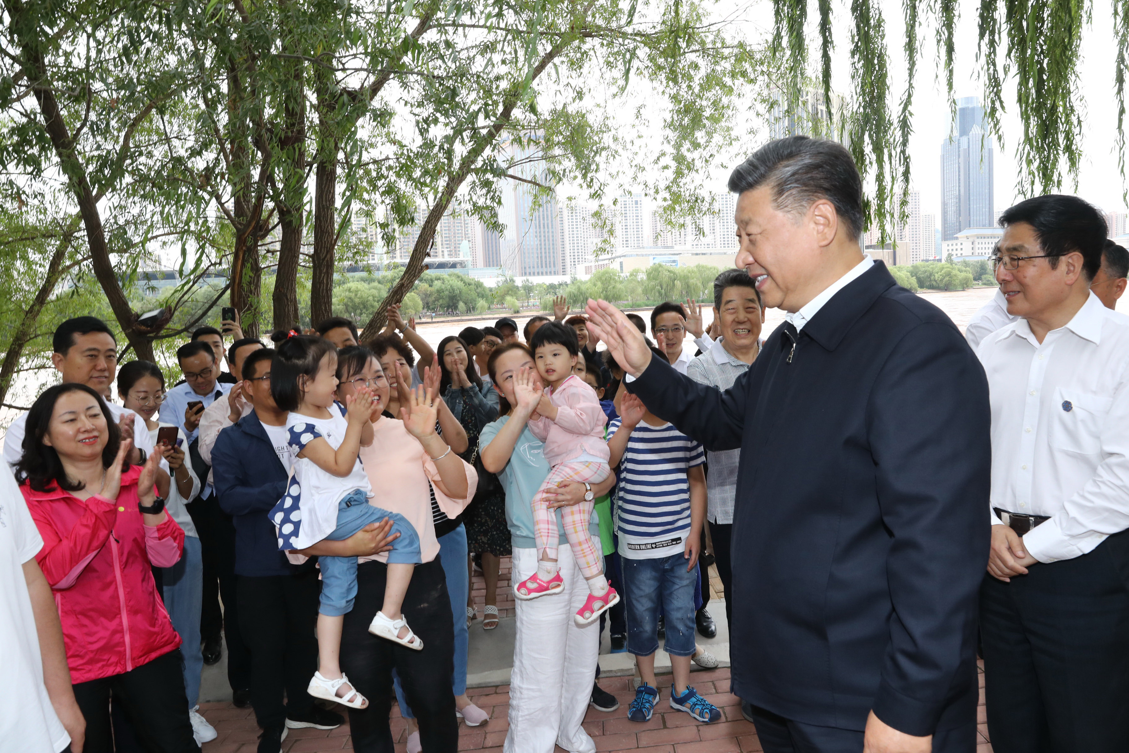 2019年8月21日,习近平在兰州市黄河治理兰铁泵站项目点同正在休闲的群众亲切交谈。