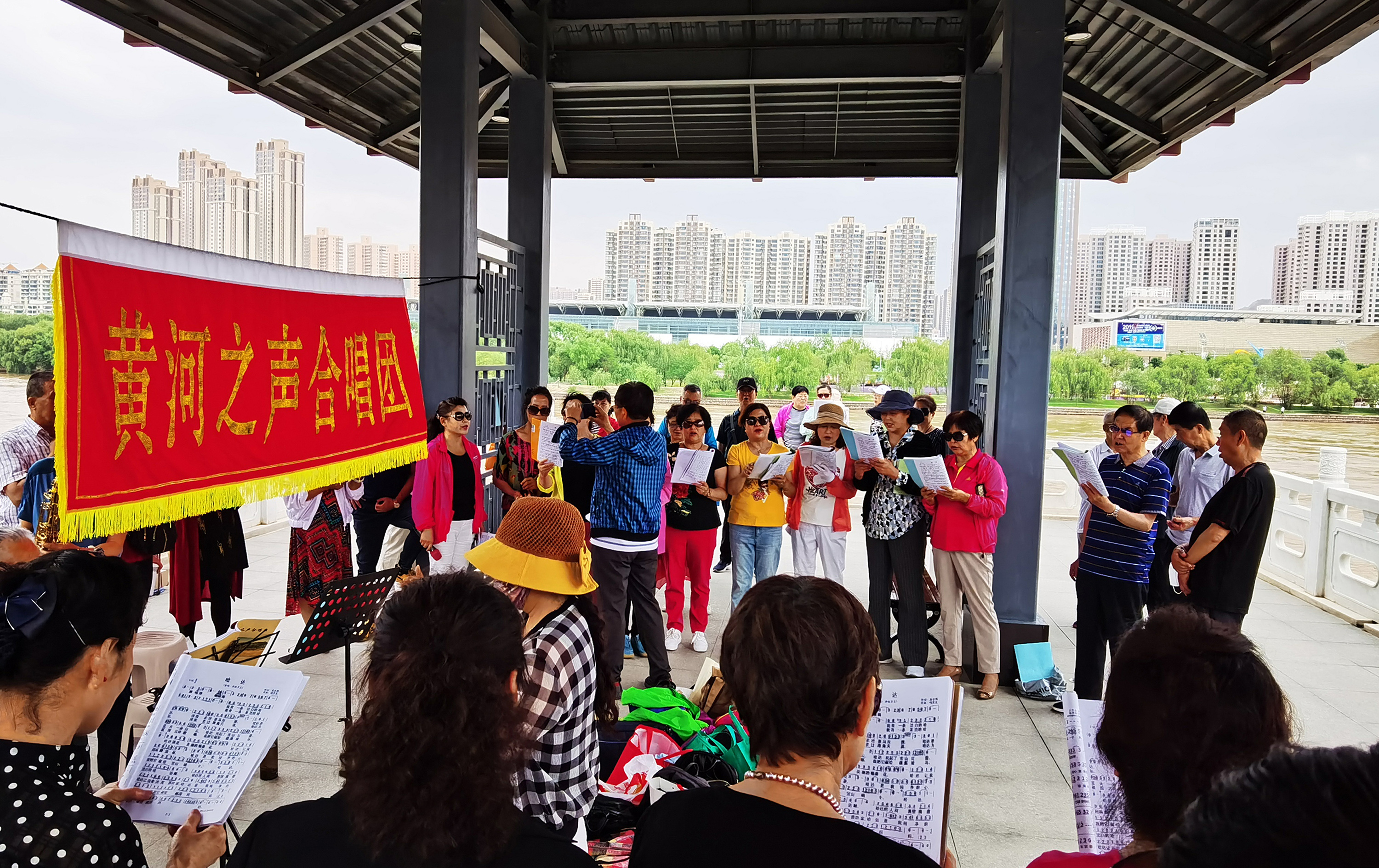 在兰州市城关区黄河治理兰铁泵站项目点,黄河之声合唱团开展合唱活动(2020年6月15日摄)。