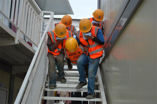 本次演练模拟施工现场电焊作业不慎点燃易燃材料挤塑板引发起火,引燃旁边管理人员宿舍,导致一名人员疏散转移不及时被困。演练现场设置了现场抢险、医疗救护、技术保障、物资设备保障、安全警戒、后勤保障6个应急小组。随着总指挥一声令下,演练人员立即组织人员紧急疏散,对被围困的二楼作业人员进行救援,同时组织人员进行灭火,参演人员按照既定路线有序逃生,安全到达指定地点。同时邀请消防支队讲解常用的消防器材及灭火设施。