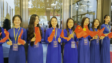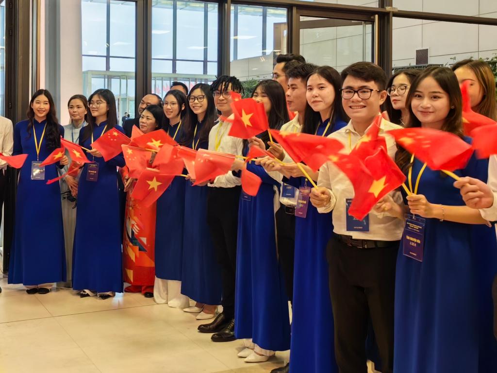 习近平总书记和夫人彭丽媛抵达国家会议中心时,受到越方青年代表热烈欢迎。