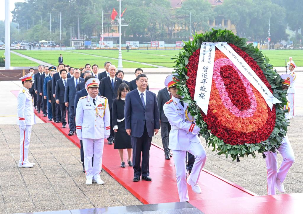 13日上午,习近平总书记在河内瞻仰胡志明陵并敬献花圈。