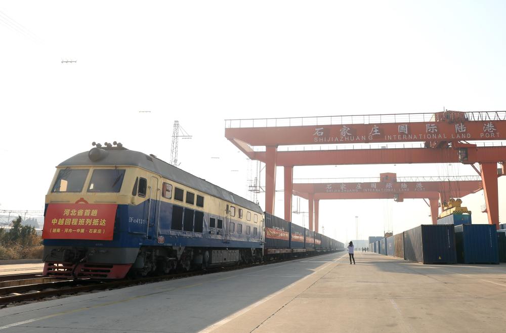 河北省首趟中越回程班列抵达石家庄国际陆港(2023年12月5日摄)。新华社发(梁子栋摄)
