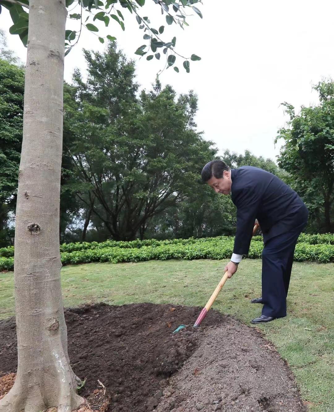 △2012年12月8日,习近平总书记在深圳莲花山公园,向邓小平铜像敬献花篮。离开前,他挥锹铲土,种下一棵高山榕树。