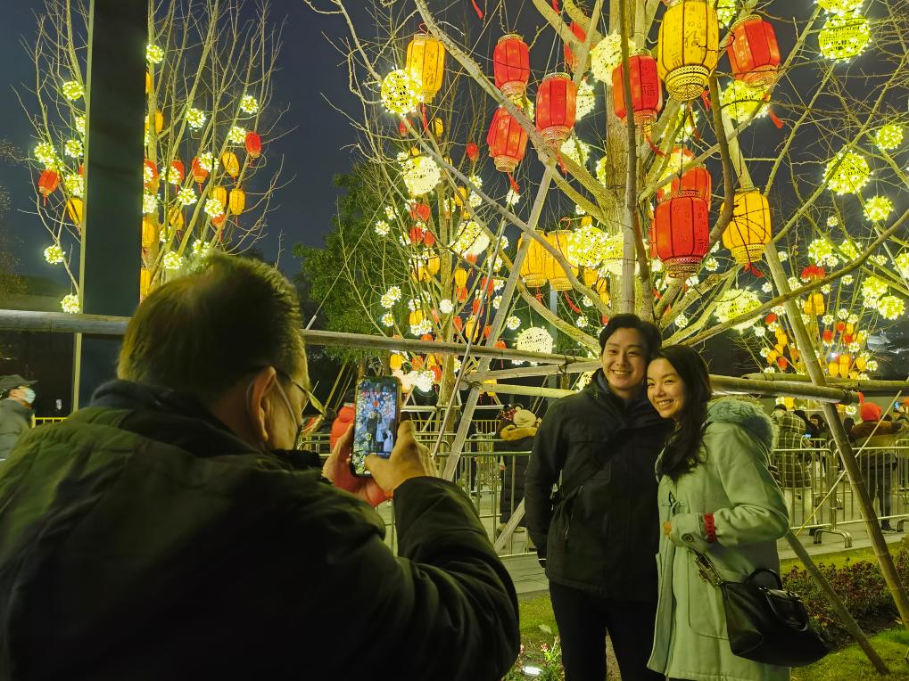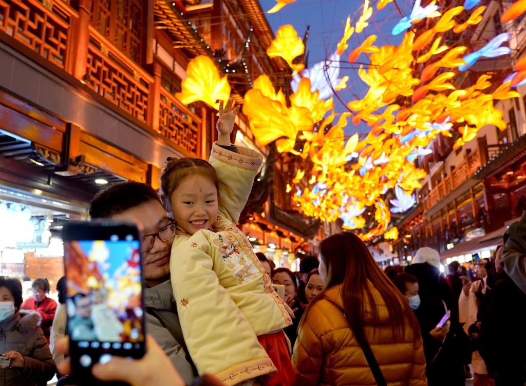 2023年12月30日,人们在上海豫园商城观灯拍照。新华社记者 刘颖 摄