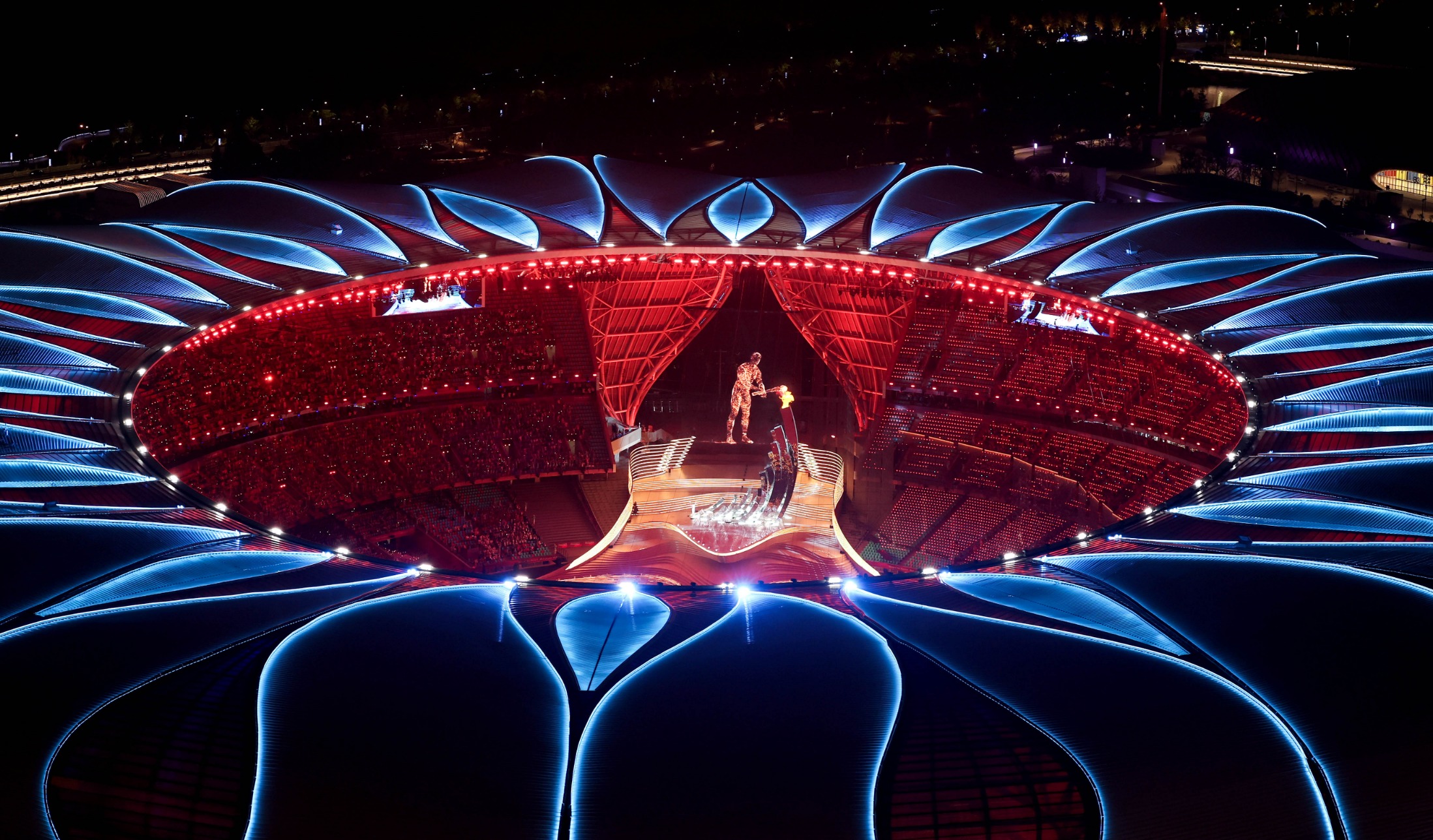 2023年9月23日,最后一棒火炬手汪顺和数字火炬手在杭州亚运会开幕式上点燃主火炬。新华社记者 程婷婷 摄