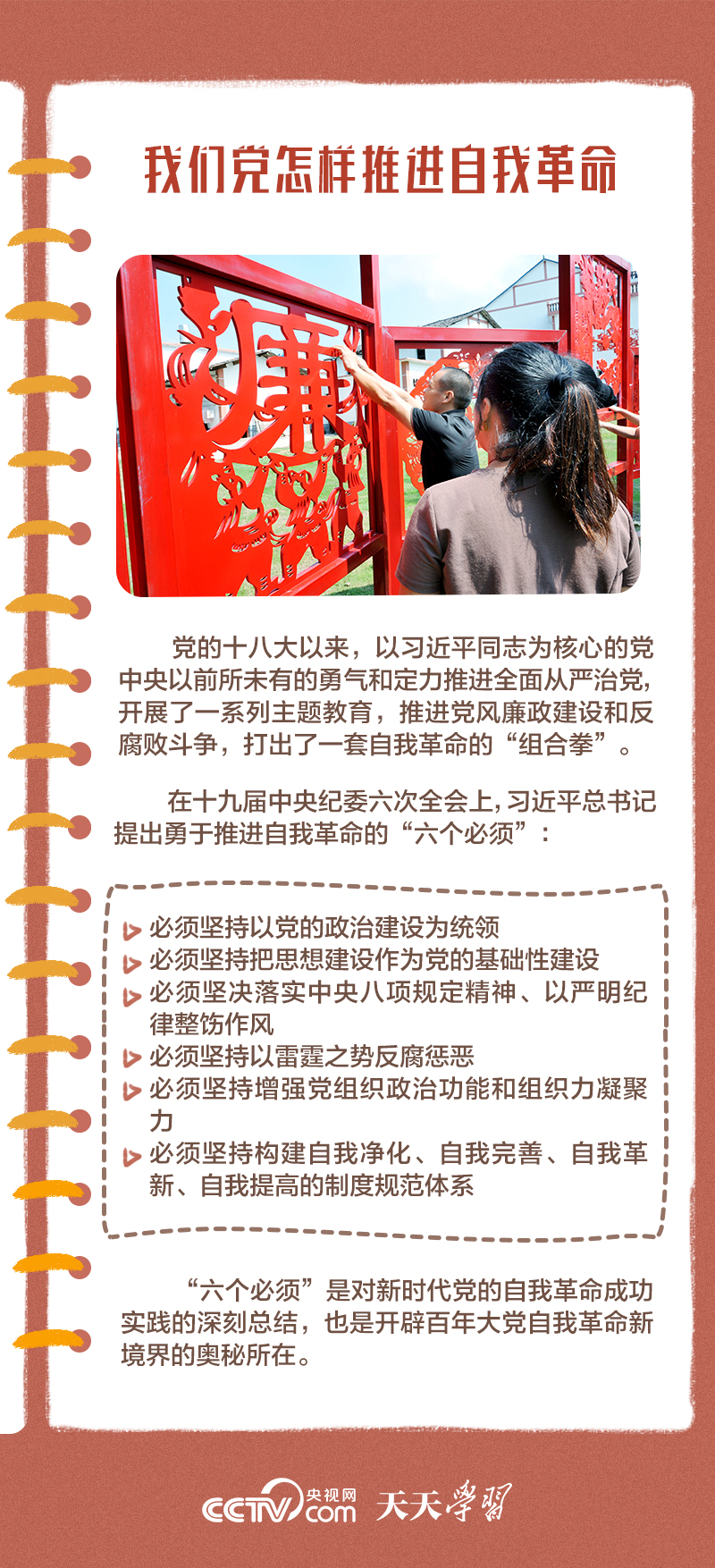 勇于自我革命是我们党最鲜明的品格和最大的优势,总书记多次对推进党的自我革命作出重要部署。此次会议上,总书记深刻阐述了党的自我革命的重要思想,明确提出需要把握好九个问题,并对持续发力、纵深推进反腐败斗争作出战略部署。央视网《天天学习》与您一起学习。