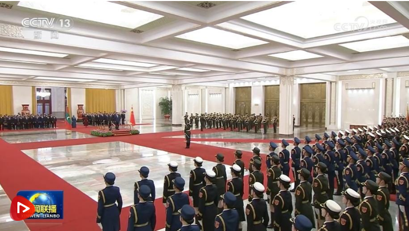 穆伊兹在习近平陪同下检阅中国人民解放军仪仗队。