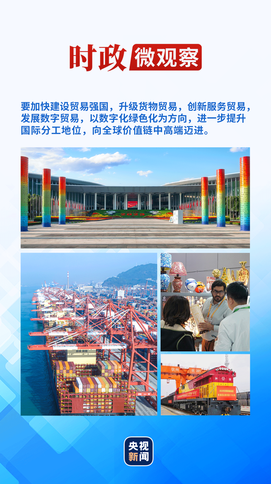 习近平总书记强调:“要加快建设贸易强国,升级货物贸易,创新服务贸易,发展数字贸易,以数字化绿色化为方向,进一步提升国际分工地位,向全球价值链中高端迈进。”